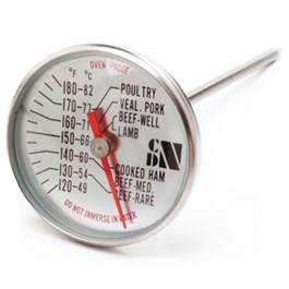 Onontbeerlijk in de moderne keuken is een (kern-) temperatuurmeter.. CDN biedt u een ruime keuze aan vlees-, frituur- en suiker-thermometers maar ook specifieke temperatuurmeters voor onder andere chocolade, foie gras en ham. Met of zonder clip (voor ophangen aan de pan) en soms met een sonde. Bij een vleesthermometer met sonde leest u de temperatuur van het digitale display, dat buiten de oven hangt. De sonde die in de kern van uw bereiding zit is met een hittebestendige draad aan dit display verbonden. Bij analoge keukenthermometers die mee de oven in kunnen, moet u de oven eerst openen of leest u de temperatuur eventueel door het ovenglas.